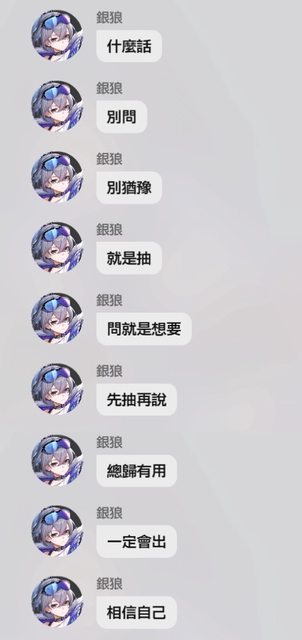 → swind86516: 小保先抽銀狼 歪了就等卡芙卡 沒歪就花點錢補到1+106/27 14:53