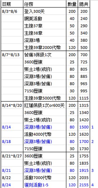 全都能達成的第一梯隊在8/14打完深淵樂土就夠了