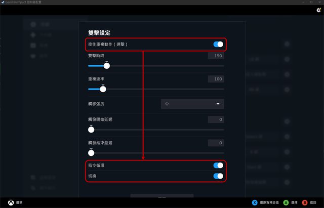 開啟按住重複動作(連擊)→開啟指令循環→開啟切換
