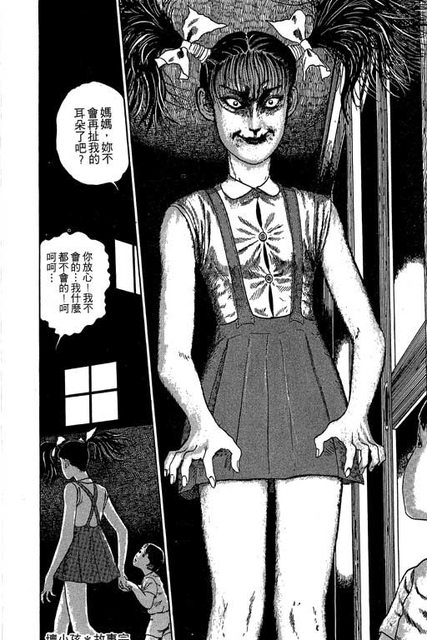 扮小孩的樣貌,更讓我想到了伊藤潤二短篇集的《壞孩子》結局的一格,那種恐怖的違和感