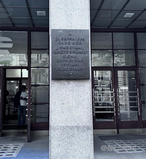 在捷克廣播電台(Czech Radio)的門口,有一塊紀念碑上寫「捷克斯洛伐克廣播電台在
