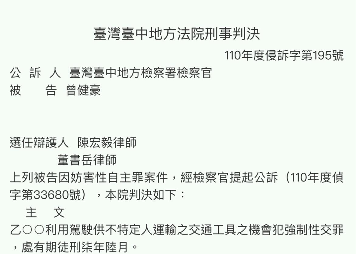 利用駕駛交通工具機會強制性交罪,將曾男加重判刑7年6月定讞。