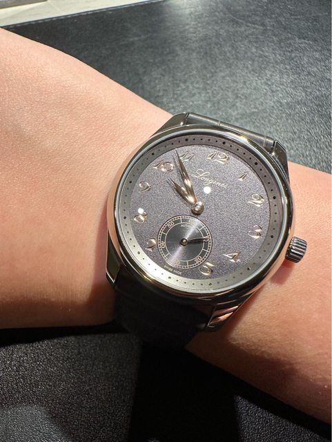 噴砂面盤很好看,搭配粉色柳葉針(個人覺得看起來偏金),搭配著草寫的Longines英文