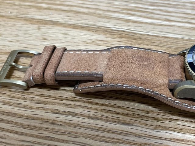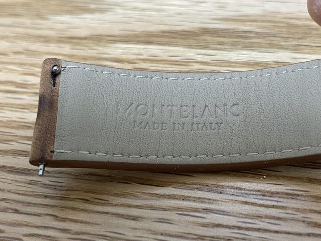 原廠表帶很厚實,義大利牛皮製,僅試戴一次,就換副廠錶帶配戴