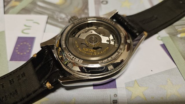 透過藍寶石玻璃錶背可以看到45小時動力存放的Cliber 6R27 機芯,這枚機芯的擺陀和底