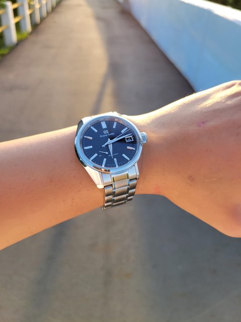 商品描述:44GS錶殼+Spring Drive機芯+午夜藍色面盤 非常閃耀動人 錶盤戶外看近似黑色 但是室內的光線照映起來又是藍色的光芒 很有特色 GS的打磨體驗過才知道 自己實測每週快不到3秒 精準度也是無須擔心