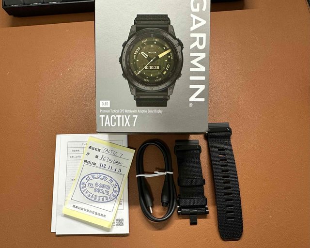 內容物:tactix 7 – AMOLED Edition、黑色尼龍戰術錶帶、黑色矽膠錶帶、專用傳輸