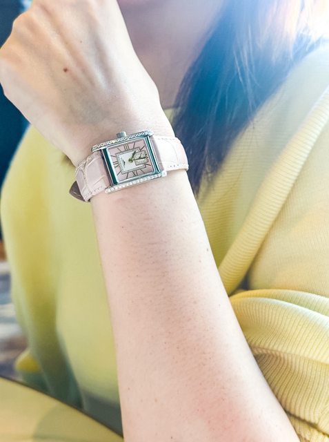 特別是左右兩排的鑲鑽排列,還有粉色底與金色羅馬數字結合的錶面