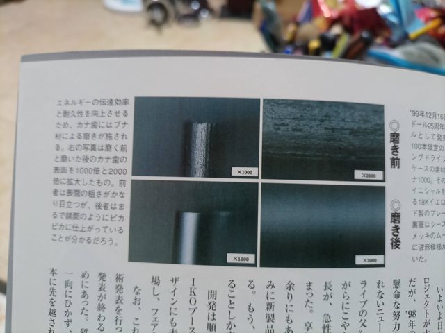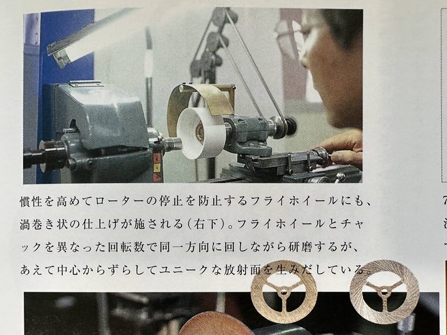 提高慣性,防止轉子停止的飛輪也進行了漩渦狀的收尾(右下角)。 飛輪和拉鍊以不同的轉數向同一個方向旋轉進行研磨,但故意偏離中心,產生獨特的輻射面。