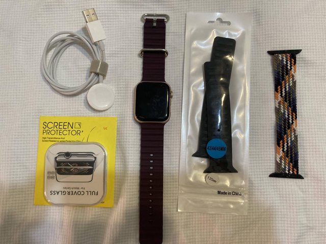 無原廠盒裝、無原廠錶帶、有原廠充電線、有副廠錶帶*3、有保護貼*2