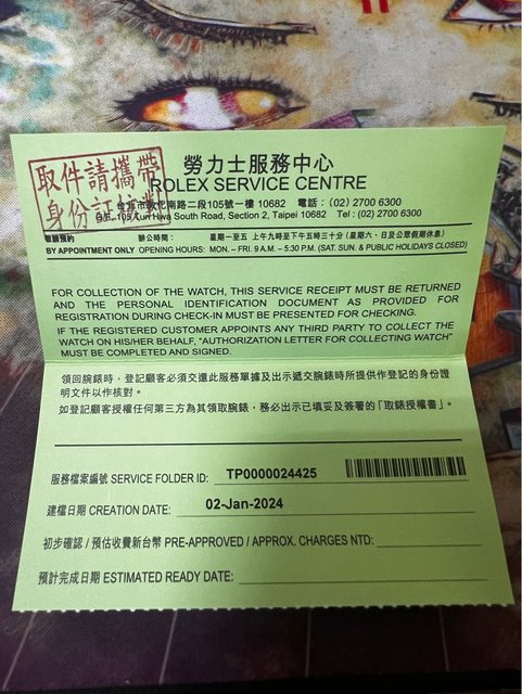 右,帶著錶跟證件交還給我,並說明檢查排程到領錶最慢可能需要一個月時間,錶檢修完
