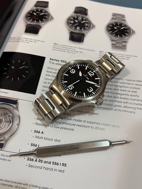 (3)Sinn很清楚的抓住556作為入門工具錶的定位,用全打磨+全印刷錶盤,沒有如很多牌子一般做出不明所以的修飾(加個閃亮亮的applied mark 之類的)。我想唯一遺憾是加了一個小日期窗,稍微破壞了平衡,我想是為了實用性所做的取捨,但必需稱許的是,Sinn把它做的非常小而且同樣上了黑色底色,就不會去搶走視覺的焦點,看得出來有在用心。
