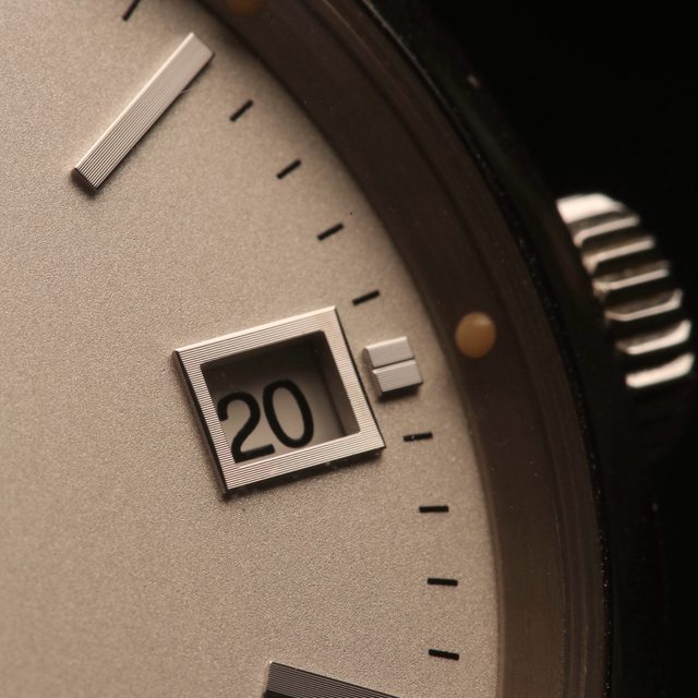 除了LOGO和時標外,日期框也加工有細緻的釘紋,並且把夜光珠分別對應時標的位置鑲嵌