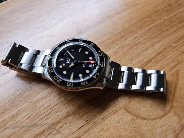 二手日常配戴品,錶帶有使用痕跡,如圖。此錶具GMT功能,藍寶石玻璃錶圈很美,且防