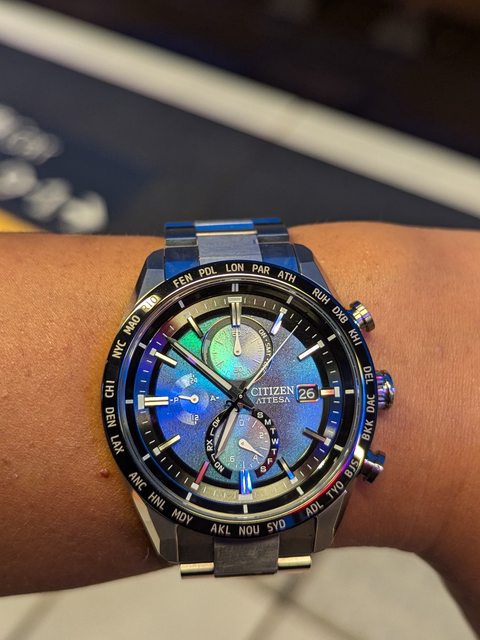 本來覺得光動能電波都是機械工業風,這款千彩之海就多了幾分神秘魔幻的感覺,有點像極光。整體鈦金屬戴起來真的很輕,一樣搭載防眩光藍寶石錶面